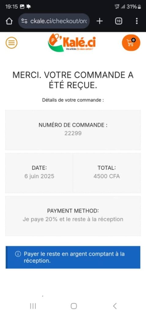 Etape2: Faite le paiement des 20% . Soit par Wave, OM, MTN ou autre et selectionner cela dans la liste . Image en bas
