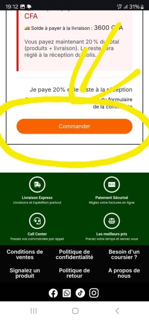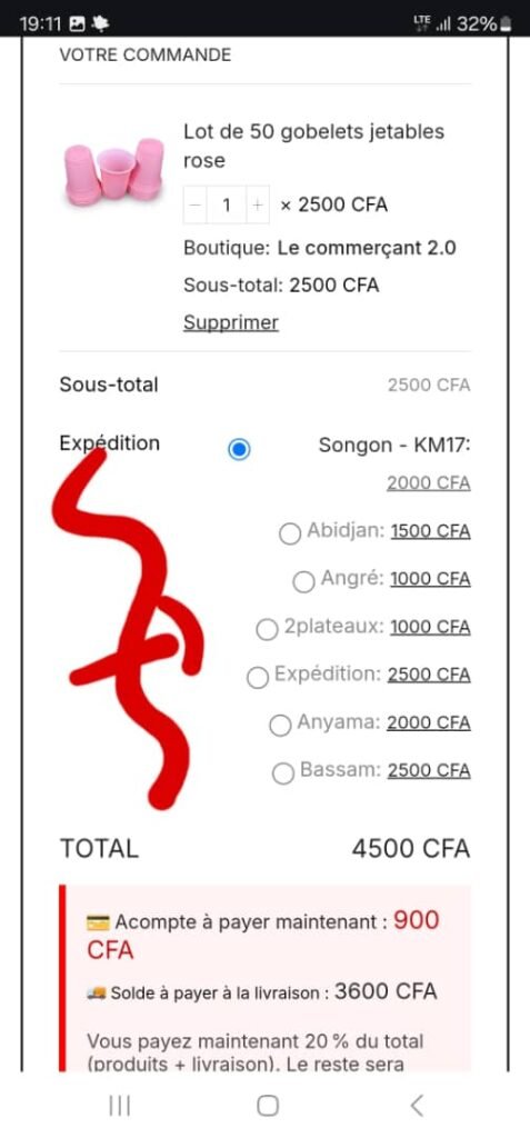 1ère étape : Réperer les 20% à payer en haut de votre écran et en bas des lieux de livraisons et remplisser le formumlaire ( votre nom, ville, commune, numéro de téléphone ...)